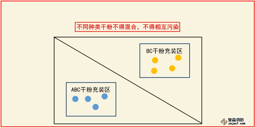 (3)ABC干粉、BC干粉充裝設備分別獨立設置,充裝場地完全分隔開。不同種類干粉不得混合,不得相互污染。