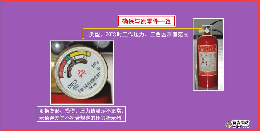 (5)更換具有嚴重損傷、變形、銹蝕等影響使用的缺陷的滅火器壓把、提把等金屬件;更換存在肉眼可見缺陷的儲氣瓶式滅火器的頂針。
