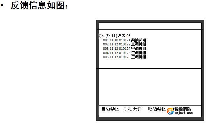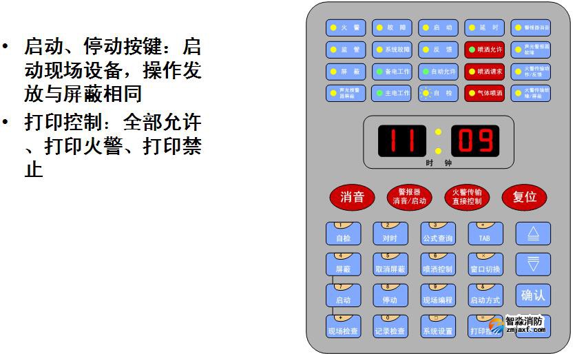 4.控制器可配置多塊手動(dòng)消防啟動(dòng)盤,完成對(duì)總線制外控設(shè)備的手動(dòng)控制;可配置多塊14路直接控制盤,完成對(duì)消防控制系統(tǒng)中重要設(shè)備的控制;可擴(kuò)充消防廣播控制盤和消防電話控制盤,組成消防廣播和消防電話系統(tǒng);每個(gè)回路最多可同時(shí)配置4臺(tái)64點(diǎn)手動(dòng)消防啟動(dòng)盤+4臺(tái)14路直接控制盤+兩個(gè)消防廣播控制盤(或2個(gè)消防電話控制盤或1個(gè)消防廣播控制盤+1個(gè)消防電話控制盤)