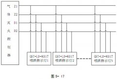 海灣GST-LD-8317噴灑燈與氣體滅火控制器的總線和電源 DC24V相連,實現噴灑噴灑功能。具體連接方法如圖 5- 17 所示。