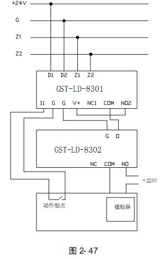 北京海灣設備GST-LD-8302切換模塊與8301模塊配合使用控制交流設備的方法如圖2- 47 所示: