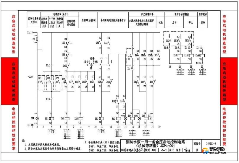 國(guó)家建筑標(biāo)準(zhǔn)設(shè)計(jì)24D303-4《消防水泵機(jī)械應(yīng)急啟泵控制》是基于國(guó)家標(biāo)準(zhǔn)《消防給水及消火栓系統(tǒng)技術(shù)規(guī)范》GB 50974-2014第11.0.12條:消防水泵控制柜應(yīng)設(shè)置機(jī)械應(yīng)急啟泵功能,并應(yīng)保證在控制柜內(nèi)的控制線路發(fā)生故障時(shí)由有管理權(quán)限的人員在緊急時(shí)啟動(dòng)消防水泵。機(jī)械應(yīng)急啟泵時(shí),應(yīng)確保消防水泵在報(bào)警后5.0min內(nèi)正常工作。本條款對(duì)消防水泵機(jī)械應(yīng)急啟泵的控制有強(qiáng)制性要求。另外工程建設(shè)全文強(qiáng)制性工程建設(shè)規(guī)范《消防設(shè)施通用規(guī)范》GB 55036-2022第3.0.12條第3款:消防水泵控制柜應(yīng)具有機(jī)械應(yīng)急啟泵功能,且機(jī)械應(yīng)急啟泵時(shí),消防水泵應(yīng)能在接受火警后5min內(nèi)進(jìn)入正常運(yùn)行狀態(tài)。本條款對(duì)消防水泵機(jī)械應(yīng)急啟泵列入到技術(shù)法規(guī)中。