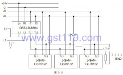 J-SAM-GST9122作為手動火災報警按鈕及消防電話插孔使用時,將報警按鈕的Z1、Z2端子直接接入火災報警控制器總線上,同時將報警按鈕的TL1、TL2端子與GST-LD-8304消防電話模塊連接,具體見圖2-11所示(最末端報警按鈕的TL1、TL2接線端子接4.7kΩ終端電阻)。
