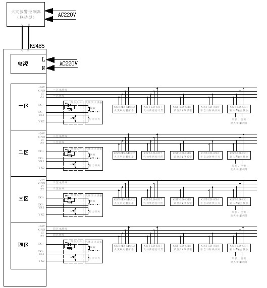 Z1、Z2:各區的總線輸出端子,連接緊急啟/停按鈕、聲光警報器、氣體噴灑指示燈、輸出模塊、手自動轉換開關等總線設備。