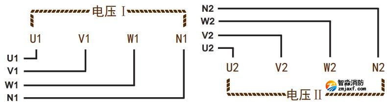 監測電壓輸入:電壓I和電壓Ⅱ:兩路獨立的三相四線電壓輸入;并接在被監測電壓上,注意U、V、W、N線的順序及極性。