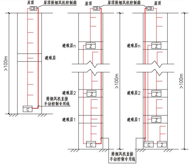 02 超過100m的建筑,除消防控制室內設置的控制器外,每臺控制控制的火災探測器、手報和模塊等不應跨越避難層。