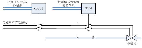 3、 電磁閥控制電源線(a位置)和電源接口箱DC651電源線接在一起,XD681失去對電磁閥電源線的控制,水炮自身報警就會噴水,自動禁止功能無效。