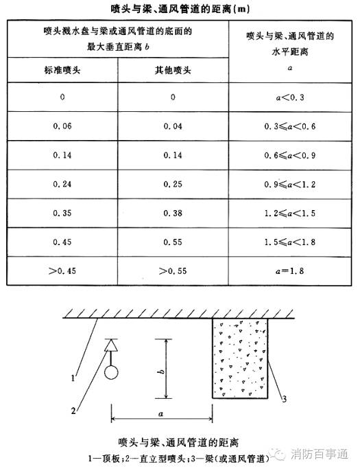 1、直立型、下垂型噴頭與梁、通風管道的距離宜符合下表的規定。