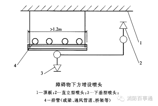 3、當梁、通風管道、成排布置的管道、橋架等障礙物的寬度大于1.2m時,其下方應增設噴頭,見下圖。增設噴頭的上方如有縫隙時應設集熱板。