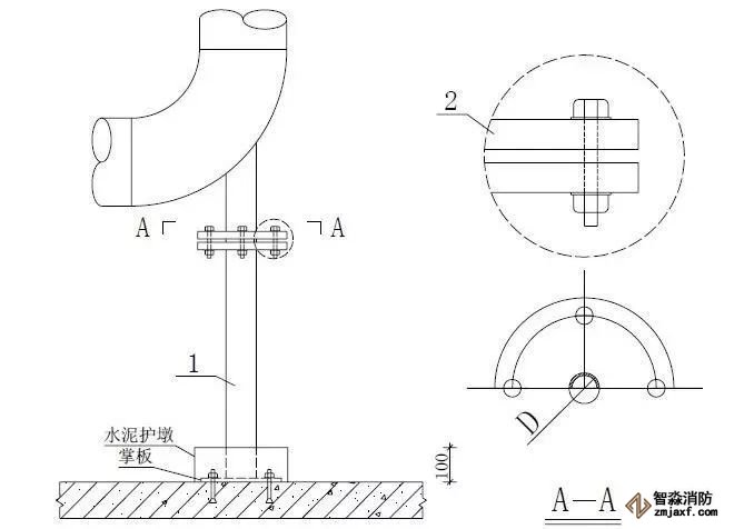 柱管法蘭盤距離地面完成面小于等于一米,管道直徑為DN100?150時,柱管為DN50;管道直徑為DN200?250 時,柱管為DN65mm;當設計另有減振要求時,需另考慮設置減振等