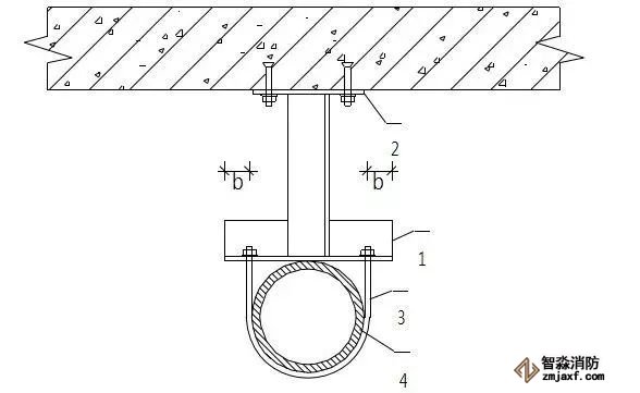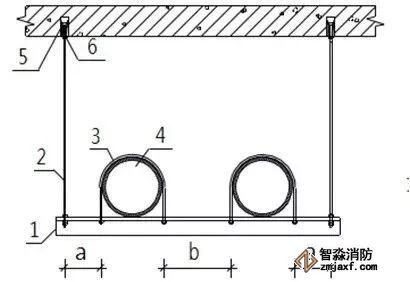 1.支架橫擔 2.鍍鋅螺桿 3.管碼 4.管道 5.頂爆螺栓 6.緊固螺栓
