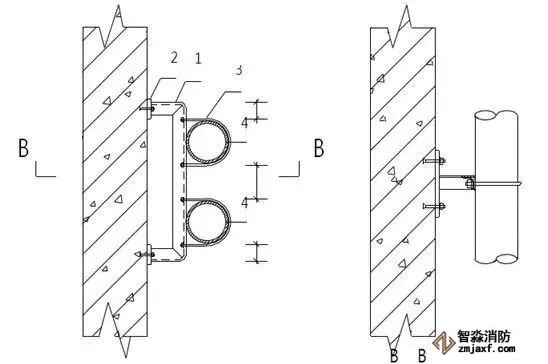1.角鋼 2.連接板(10mm,做為承重支架,當使用80以上的角鋼時采用) 3.管碼 4.管道
