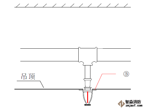 2、有吊頂的下垂型噴頭安裝噴頭根部應與吊頂平齊;為避免定位不準,可在吊頂龍骨標高確定后再安裝下噴支管;下噴頭與三通之間的短管長度不宜超過150mm