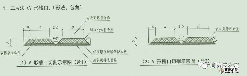 4)板材應采用機械開槽或使用專用刀具進行手工開槽,槽口形式為V形,切割時不得破壞彩鋼板表層,且切割縫必須平直。組合采用二片法(通常為L形法),對于大管徑風管的包覆宜采用四片法形式。