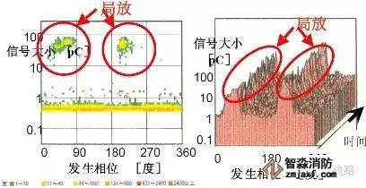 (1) 通過(guò)大量的試驗(yàn)室模擬和現(xiàn)場(chǎng)測(cè)試結(jié)果顯示:局放信號(hào)的相位與試驗(yàn)電源的相位具有180度或360度的相位特征,同時(shí)發(fā)生在一定寬度的相位上。