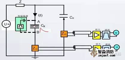 在被試驗(yàn)電纜Cx注入標(biāo)準(zhǔn)局放信號(hào)Qo以模擬被試對(duì)象發(fā)生了局部放電,當(dāng)標(biāo)準(zhǔn)局放信號(hào)注入時(shí),檢測(cè)阻抗Zm1、Zm2輸出信號(hào),測(cè)試系統(tǒng)M獲取局放信號(hào)的幅值大小、相位分布特征、頻譜特性等信息。