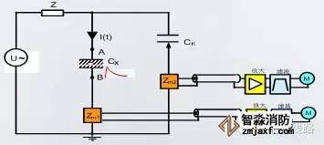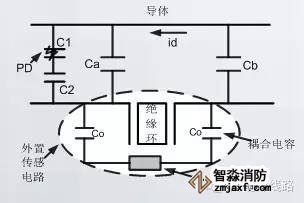 在電纜的中間接頭,測(cè)試原理如圖所示,一側(cè)電纜的鎧裝與電纜導(dǎo)體之間存在電容Ca,另一側(cè)電纜的導(dǎo)體與鎧裝之間存在電容Cb,如果在電纜的中間接頭發(fā)生局部放電,那么形成兩個(gè)電容C1和C2,此時(shí)Ca和Cb就會(huì)通過(guò)導(dǎo)體向C1和C2充放電,從而形成局放電流回路,在兩側(cè)電纜屏蔽層橋接一個(gè)高頻低阻的電容臂C0和高頻電流傳感器,就可以檢測(cè)到局放的脈沖電流信號(hào)。