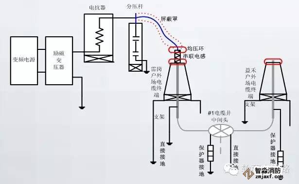 變頻諧振系統(tǒng)輸出的電源不能直接作為電纜局放試驗(yàn)的電源直接施加于被試對(duì)象進(jìn)行局部放電測(cè)試,必須采取有效措施對(duì)試驗(yàn)電源進(jìn)行預(yù)處理,通過(guò)設(shè)置串聯(lián)電抗、防暈導(dǎo)線、均壓環(huán)進(jìn)行對(duì)試驗(yàn)電源質(zhì)量進(jìn)行改善,其電氣原理所下圖所示。