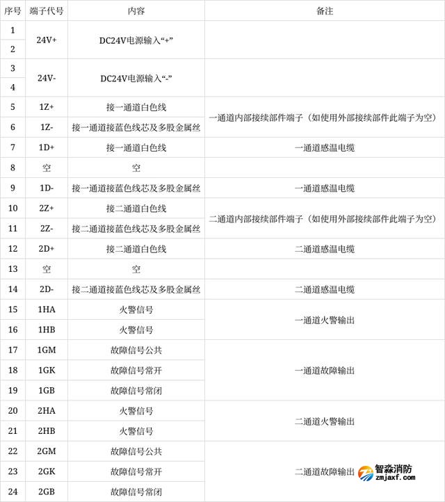 按圖3要求,將24V電源線、信號線從防水接頭穿入盒體,接入相應的接線端子,感溫線纜兩端穿入微電腦處理器和終端盒上的防水接頭,擰緊防水接頭。一通道感溫電纜白色線芯接1D+端子,藍色線芯及金屬絲接1D-端子,(如使用信號處理單元內部的接繼部件,感溫電纜的另一端白色線芯接在1Z+端子、藍色線芯接1Z-端子)。二通道感溫電纜白色線芯接2D+端子,藍色線芯及金屬絲接2D-端子,(如使用信號處理單元內部的接繼部件感溫電纜的另一端白色線芯接在2Z+端子、藍色線芯接2Z-端子)。